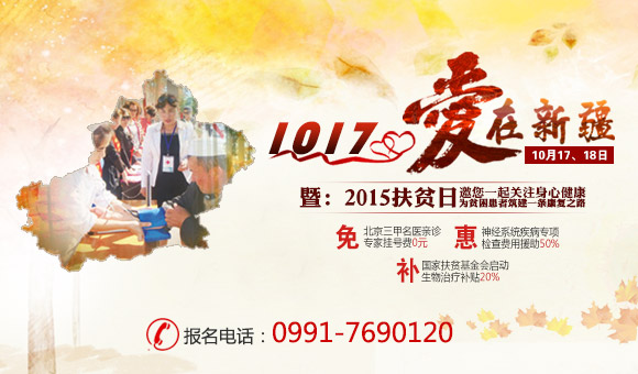 2015年10月17日至2015年10月18日,“1017·爱在新疆”暨:2015扶贫日邀您一起关注身心健康公益行动期间,多名北京三甲名医将联合坐诊于乌鲁木齐爱德华医院,让新疆人民有机会足不出户的享受北京专家亲诊的机会;同时,在聚梦公益康复基金会的支持下,提前预约申请的患者,有机会申请到原价380的神经系统疾病专项检查AF脑神经功能动态检测费用援助50%、多项国际先进生物疗法费用援助20%。
